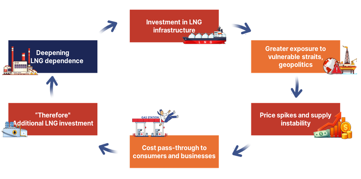 What emerges is a self-reinforcing cycle where continued buildout of LNG infrastructure heightens susceptibility to geopolitical disruptions and other related risks, which, ironically, is then used to rationalize additional LNG investment in the name of energy security. Diversification merely reinforces existing dependency, bringing only temporary relief and potential short-term gains while the fate of countries’ entire energy systems hangs in the balance.