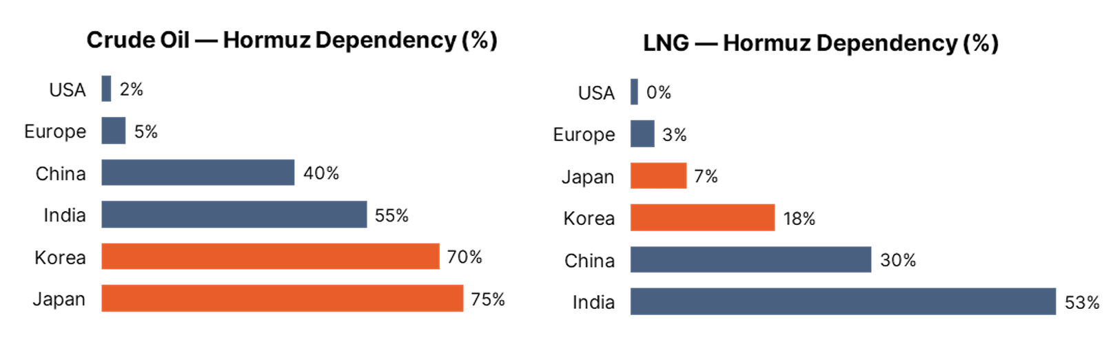For Japan and South Korea in particular, heavy reliance on fossil fuel imports from this geopolitically sensitive region means disproportionate exposure to price shocks emerging from the current crisis, throwing a wrench into LNG-dominated energy security strategies. South Korea funnels 70% of its crude oil and 18% of its LNG imports through the two-mile wide Strait of Hormuz, with Japan’s slightly more diversified LNG import portfolio leaving its rate of dependency at a lower 7%.