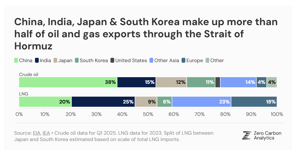In 2024, 84% of oil and 83% of LNG exports passing through the Strait of Hormuz were destined for Asian markets. Recent numbers indicate China, India, Japan and South Korea alone account for 75% of oil and 59% of LNG traffic passing through the strait.