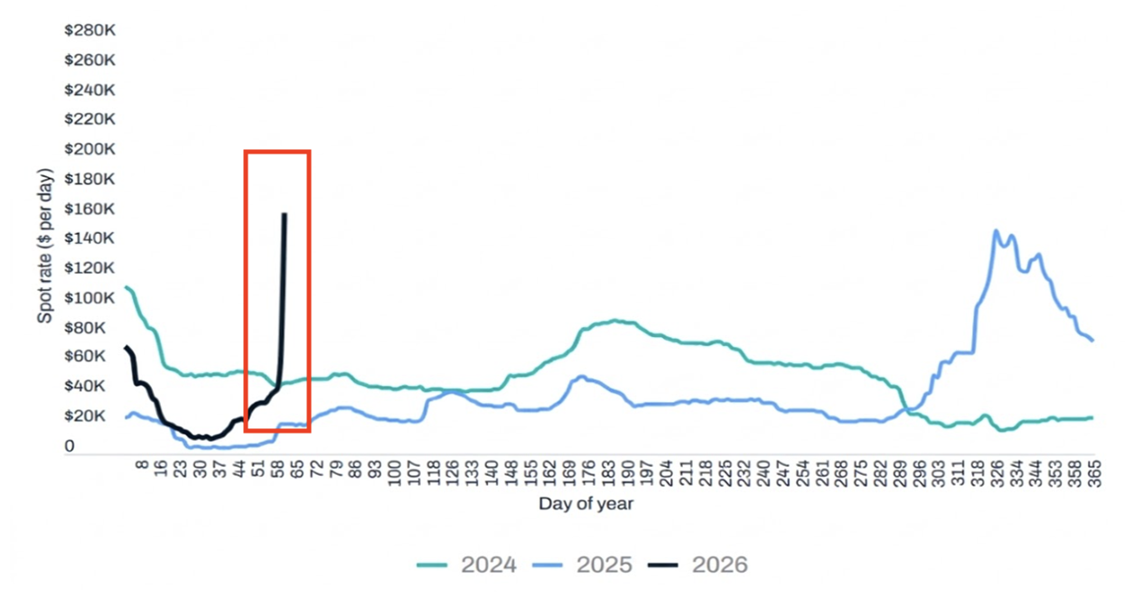 2024年、2025年、2026年のLNG船スポット傭船料($/日)の年間日別推移
