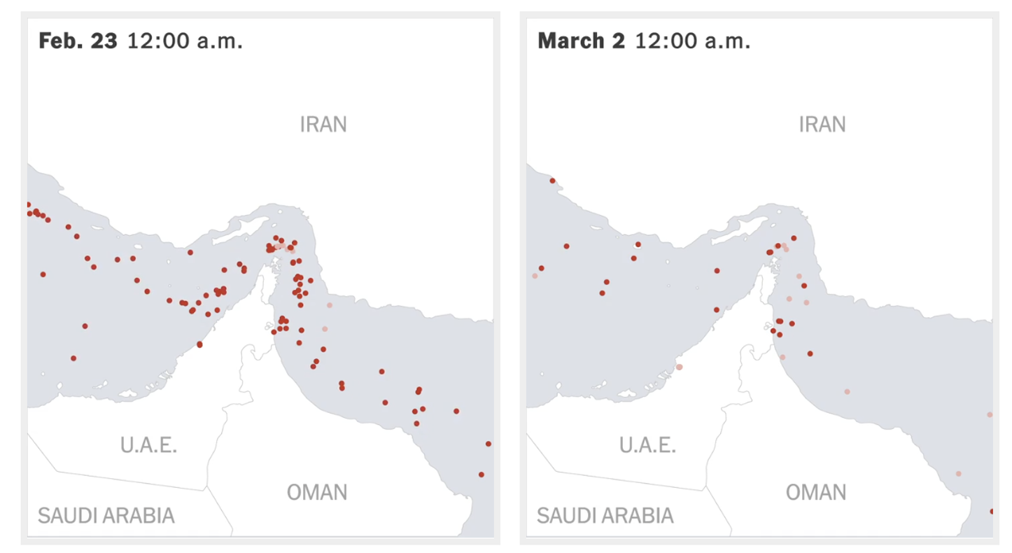 対イラン攻撃開始前後のホルムズ海峡付近の船舶状況