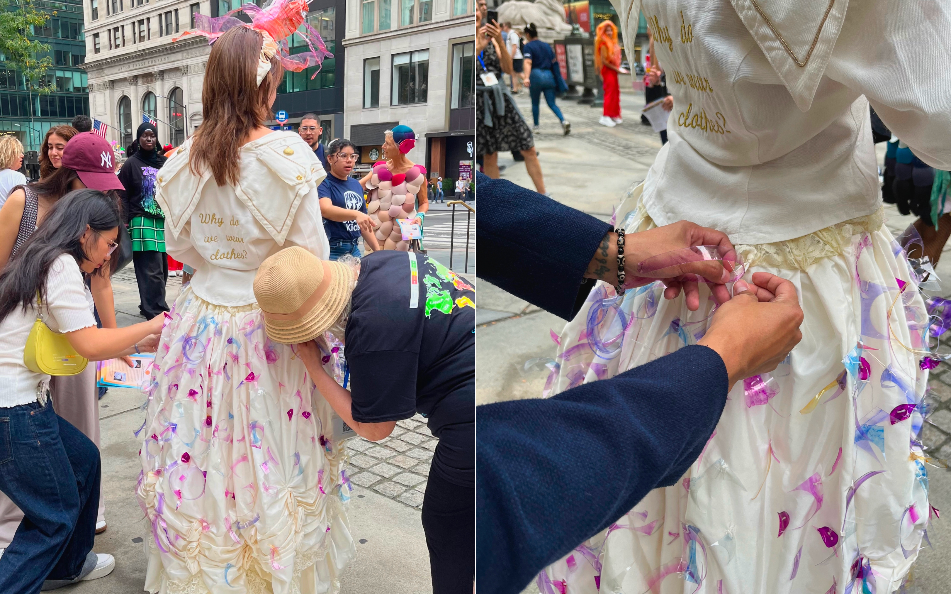 9월 24일, 뉴욕 공공도서관 앞 거리에서 한 행사가 열렸다. 모델이 입은 드레스에 참가자들이 폐페트병 조각을 바늘과 실로 꿰매어 붙였다. 행사는 패스트패션이 만든 기후와 환경 파괴의 속도를 늦추고, 버려진 것을 다시 짜는 순환의 의미를 행동으로 보여주기 위해 기획됐다. ‘패션의 속도를 늦추자’는 메시지를 담고 있었다.