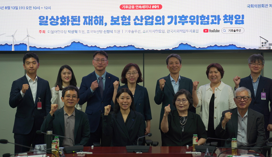 세미나에서는 보험연구원과 한국은행, 농업정책보험금융원 등 관련 기관과 현대해상, 소비자시민모임 등 기업과 시민사회가 함께 이러한 현실을 개선하기 위한 구체적인 방안을 제시했습니다. 공공기관과 지자체가 보험사 선정 시 기후금융 실적을 평가 기준에 포함하고 이를 투명하게 공개하는 제도, 재생에너지 발전량 변동을 보완하는 지수형 날씨보험 활성화, 기후대응을 위한 산업 차원의 공동행위에 대한 공정거래법상 면책 규정 마련 등 다양한 논의가 이뤄졌습니다.