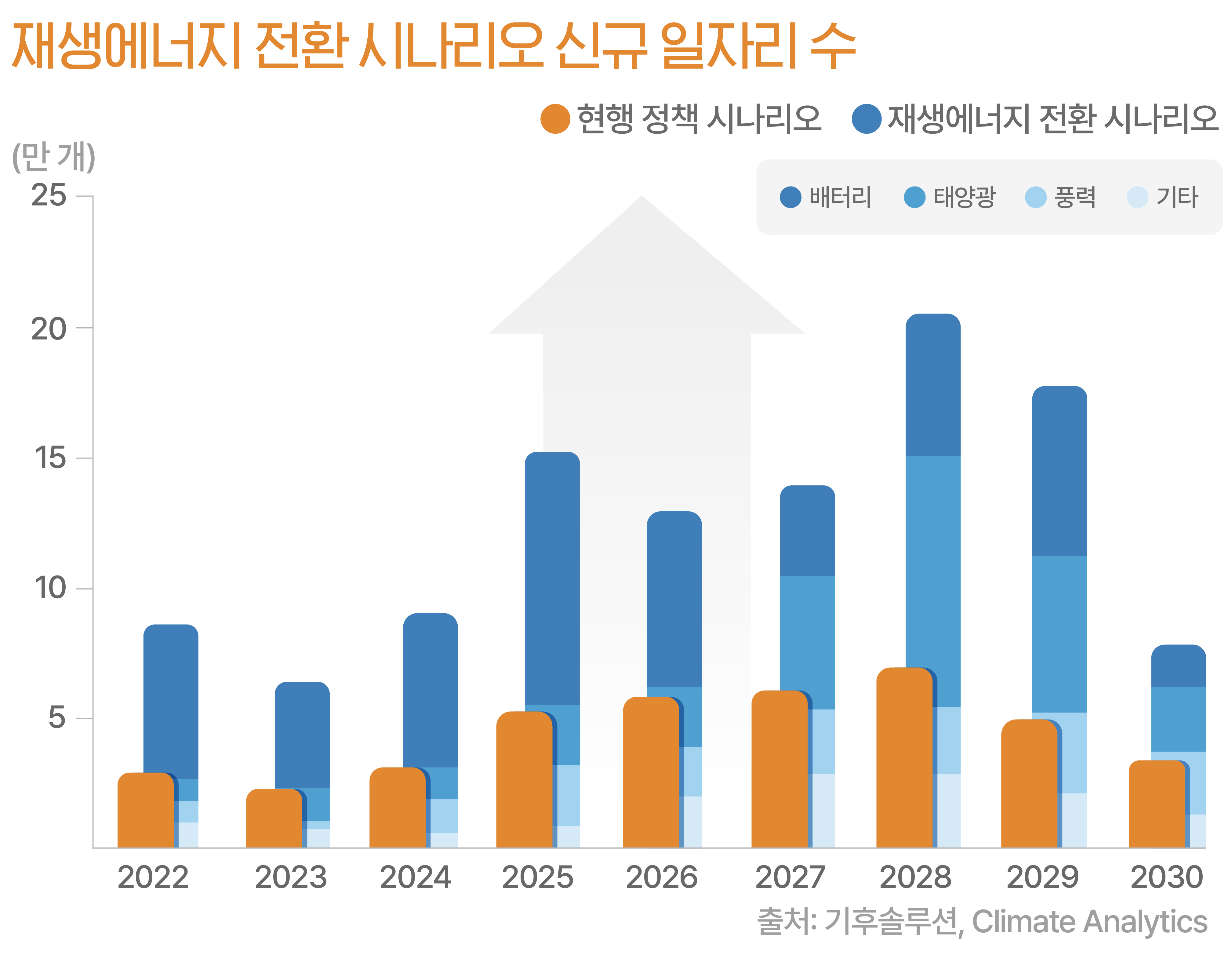 석탄, LNG 수입으로 해외로 빠져나가는 50~60조 원을 아껴서 재생에너지로 전환하면, 매년 12만 개의 일자리가 국내에 생길 거라 예상돼요. (재생에너지 설비 운영, 배터리 제조 등)
