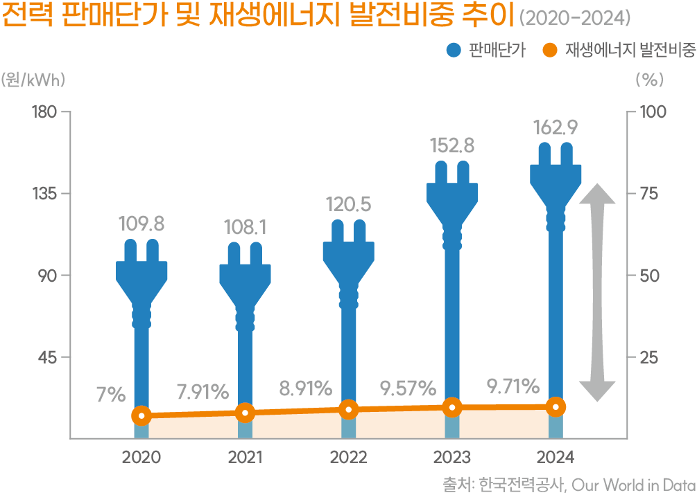 2020년부터 2024년까지 전기요금은 올랐지만 연평균 10% 올랐지만, 재생에너지는 늘어봤자 연간 1%p에 그쳤다는 걸 볼 수 있어요.