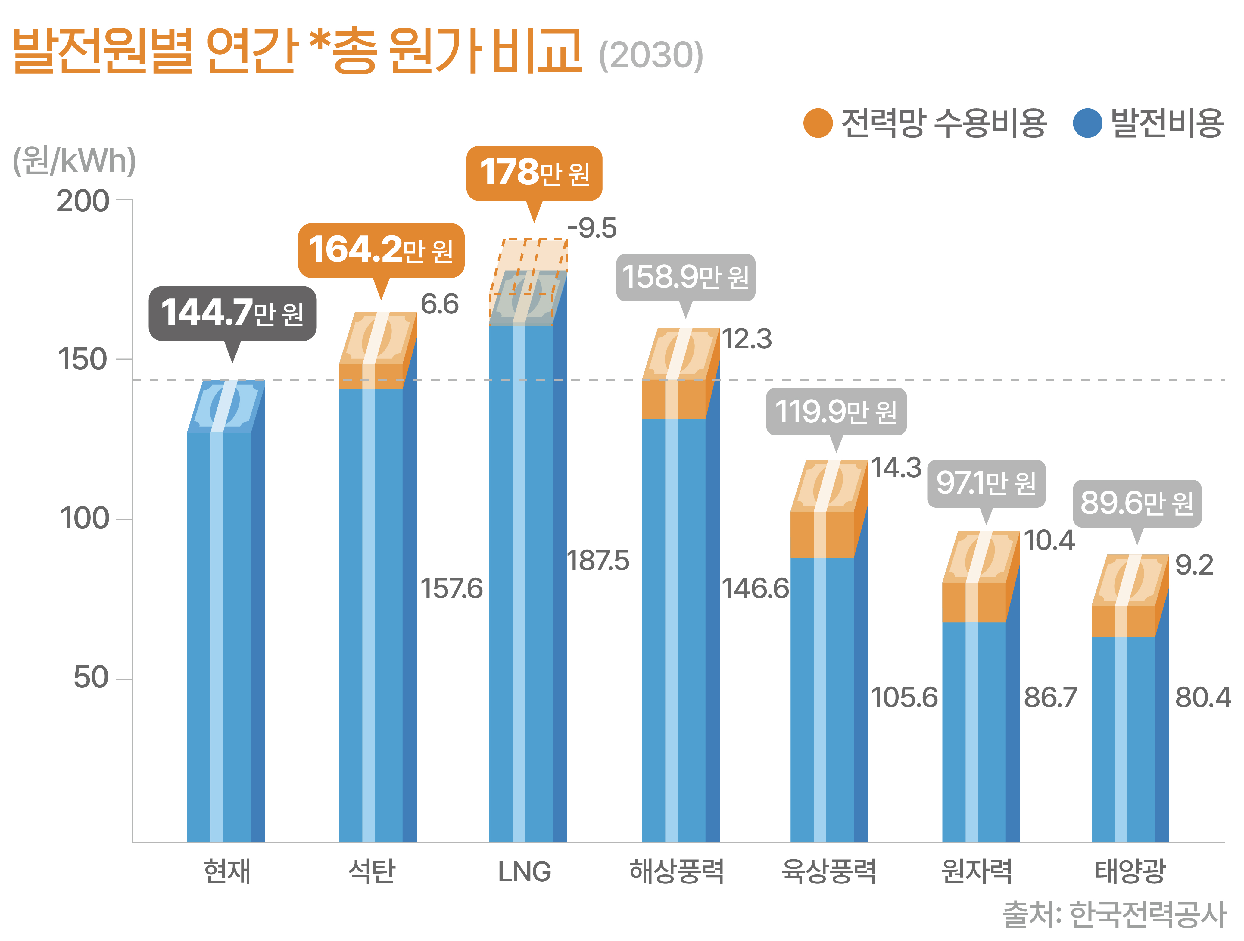 여러 발전원이 섞인 현재 원가는 약 145만 원이지만 2030년에 같은 양을 100% 태양광으로만 생산하다면 원가는 약 90만 원 정도예요. 육상풍력 원가도 석탄이나 LNG보다 더 저렴할 것으로 예상돼요. 실제로 한전은 세계 최저 비용으로 육상풍력 사업을 수주한 적 있어요.