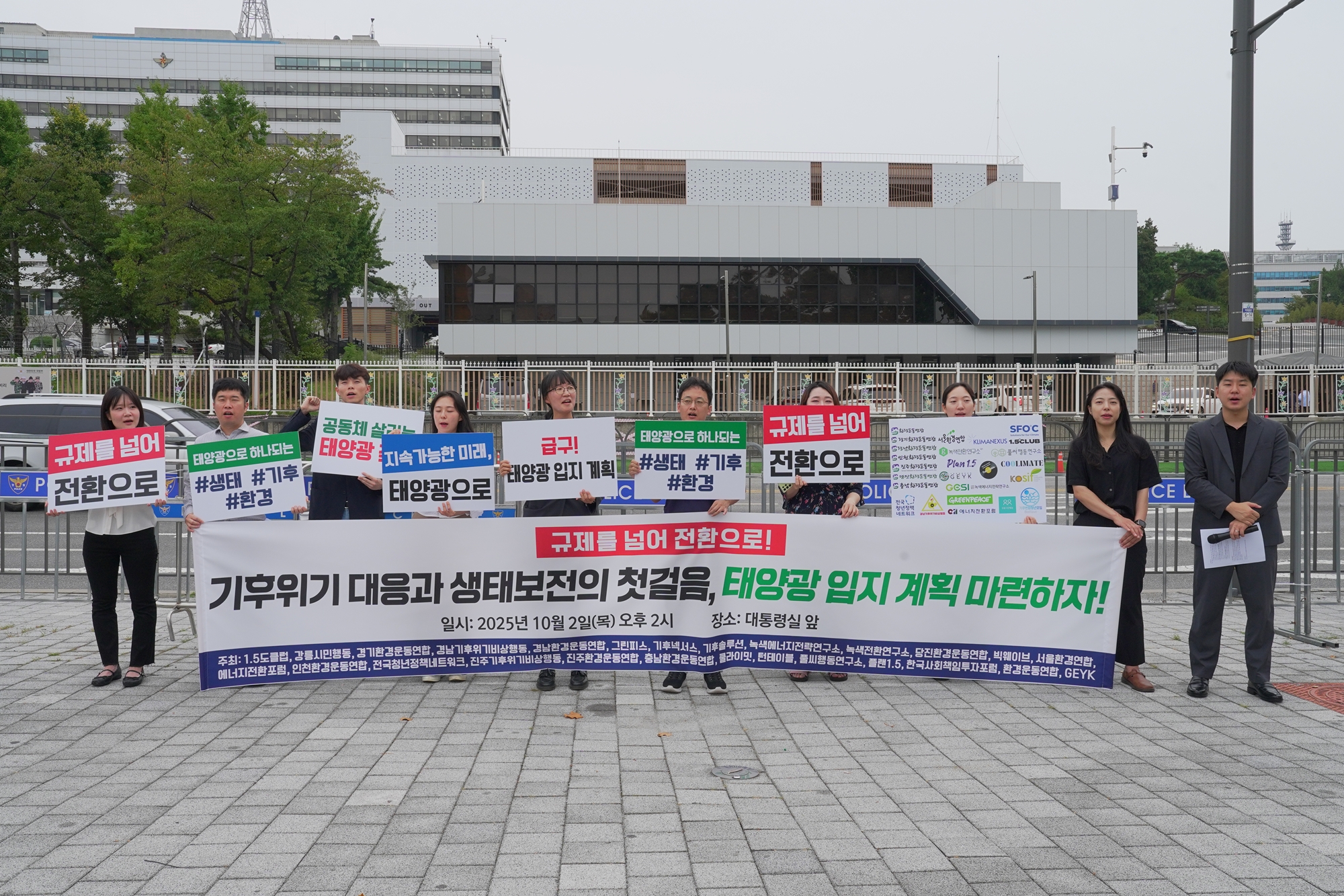 참석자들은 “재생에너지 확대와 생태계 보전은 양립할 수 있으며, 오히려 함께할 때 지속가능성이 강화된다”며 “대통령실이 나서 국토부와 산업부의 행정을 전환시키고, 기후에너지환경부가 시대적 과제를 수행하도록 지시해야 한다”고 촉구했다. 이어 “규제를 넘어 전환으로”라는 구호를 제창했다.
