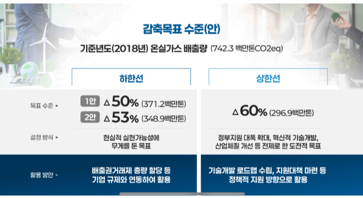 6일 진행된 ‘2035 NDC 대국민 공개 논의 공청회’에서 정부는 하한선으로 50%와 53%의 2개 안, 상한선으로 60%를 제시한 상태. 하한선은 배출권거래제 총량 할당 등 기업 규제와 연동하고, 상한선은 기술개발 로드맵 수립 및 지원대책 마련 등 정책적 지원 방향으로 활용한다는 것이 골자.