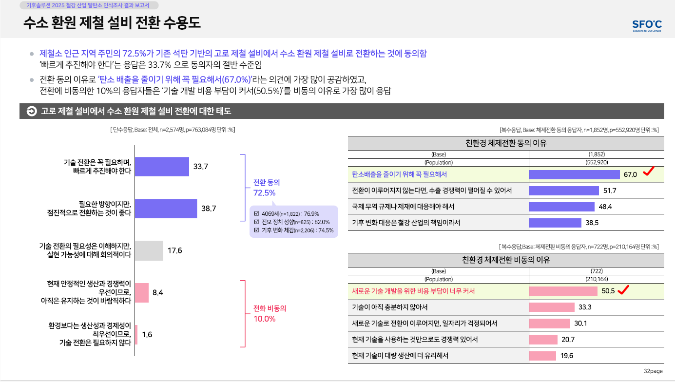 이런 상황에서 지역 주민들은 산업 경쟁력 유지를 위한 해법으로 △수출 경쟁력 회복(44.5%) △고급 철강 제품 생산(40.1%) △친환경 기술 투자(39.3%)를 꼽았다. 특히 응답자의 72.5%는 수소환원제철 설비 전환에 찬성했으며, 33.7%는 “가능한 한 빠르게 추진해야 한다”고 답했다. 찬성 이유로는 온실가스 감축, 수출 경쟁력 강화가 꼽혔다.