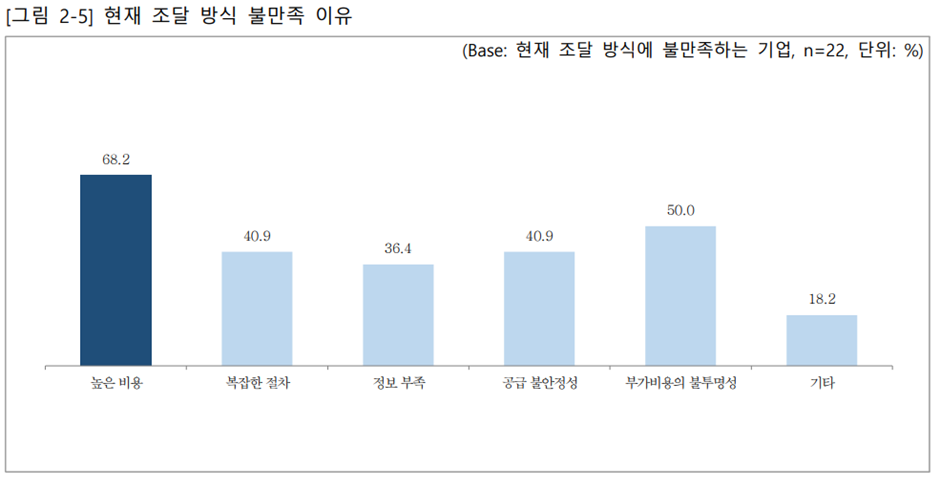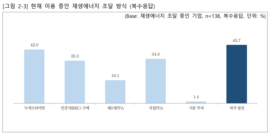 그 결과, 대기업과 전력 사용량이 많은 기업일수록 재생에너지 조달을 ‘기후 대응’이 아니라 ‘국내 산업의 존망과 직결된 문제’로 인식하고 있는 것으로 나타났다. 실제로 ‘재생에너지 조달이 필요한 이유’를 묻는 질문(그림 2-2)에서 기업들은 ▲ESG/지속가능경영 목표 달성(54.7%) ▲RE100 이행 필요(35.9%) ▲고객사/협력사 요구사항(33.5%) 등을 주요 이유로 꼽았다. 이는 재생에너지 조달이 더 이상 기업의 자율적인 기후 대응 차원이 아니라, 공급망 거래 유지와 국제 시장 접근을 좌우하는 필수 조건이 됐음을 보여준다. 즉 기업들은 이미 재생에너지 조달의 필요성 자체는 분명히 인식하고 있었다. 그러나 이러한 높은 필요성 인식에도 불구하고, 실제 재생에너지 조달 방식은 기업들의 기대와는 상당한 괴리를 보이고 있었다. 이는 산업계의 재생에너지 도입 의지는 높지만, 제도 설계가 이를 따라가지 못하는 구조적 병목이 존재함을 보여준다.