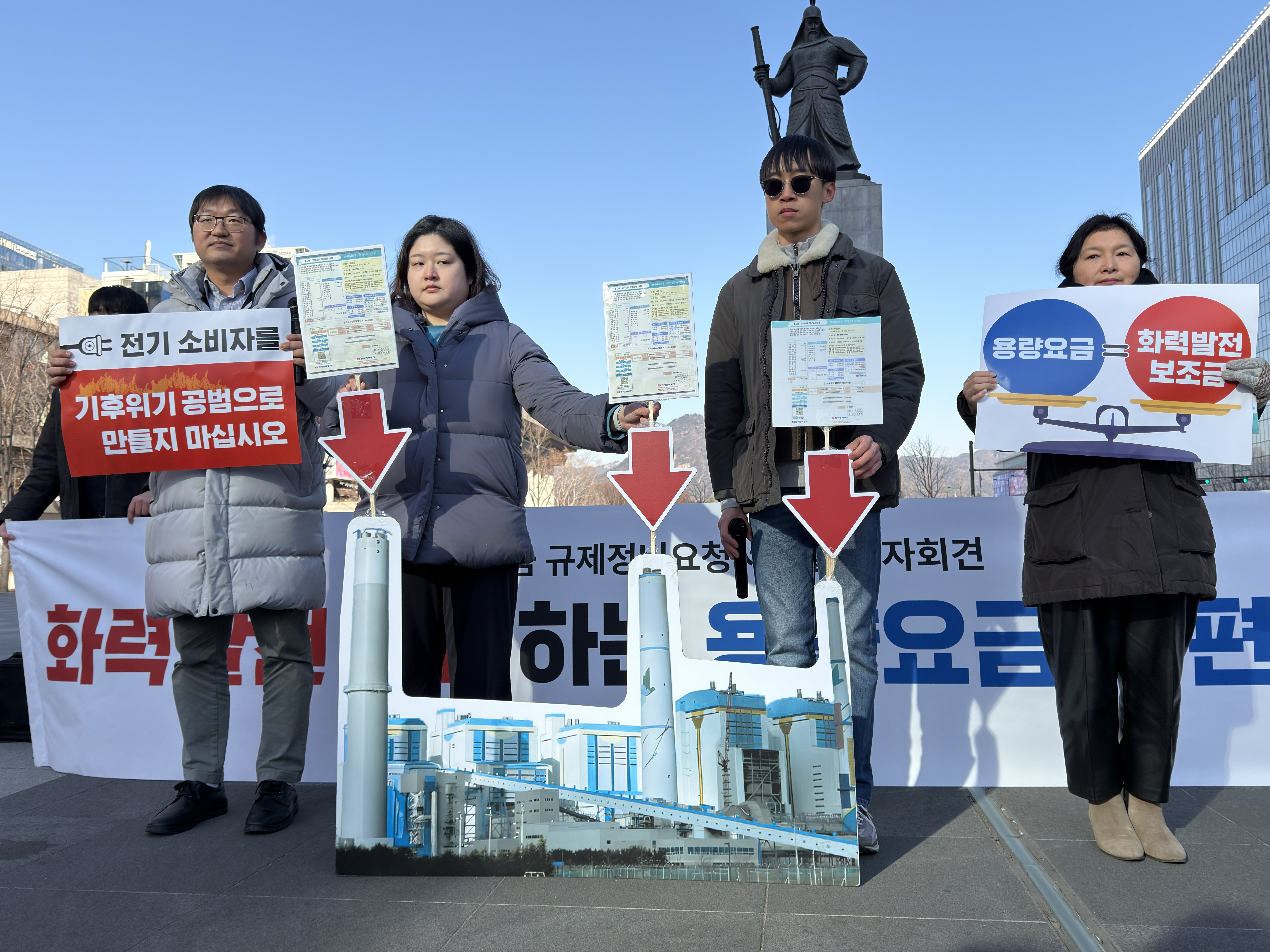 기후솔루션과 녹색소비자연대전국협의회는 6일 오전 광화문 광장 이순신 동상 앞에서 기자회견을 열고, 화석연료 발전을 보조하는 용량요금 지급 구 조를 문제 삼아 규제정비요청서를 규제개혁위원회에 제출했다고 밝혔다. 규제정비요청은 현실과 맞지 않거나 국민에게 불편을 주는 법령·제도를 고쳐달라고 정부에 공식 제안하는 제도다. 단체들은 현행 용량요금 제도가 실제로 전력을 생산하지 않더라도 화력발전소의 지속 운영을 보장하는 구조로 설계돼 있으며, 그 비용이 전기요금이라는 형태로 전기소비자에게 전가되고 있다고 지적했다.