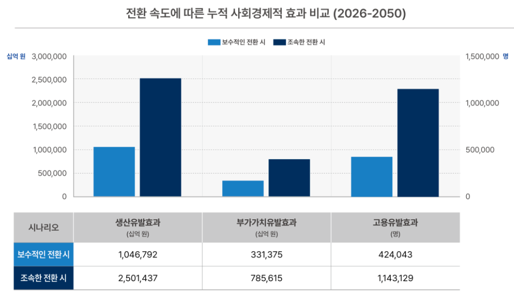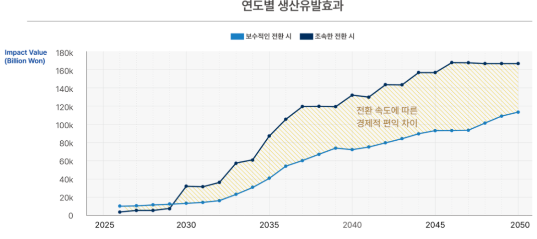 전환 초기에는 고로 공정 축소에 따른 기존 산업의 위축으로 사회경제적 효과가 일시적으로 정체되는 구간이 나타날 수 있다. 화석연료 기반의 생산·고용은 즉각 감소하는 반면, 수소환원제철의 핵심인 재생에너지 및 그린수소 산업의 부가가치는 기술 상용화 시점인 2030년 이후부터 본격화되기 때문이다. 그러나 장기적으로는 수소 연관 산업의 성장이 기존 산업의 감소분을 압도하며 조기 전환의 편익이 보수적 시나리오를 크게 상회하게 된다.