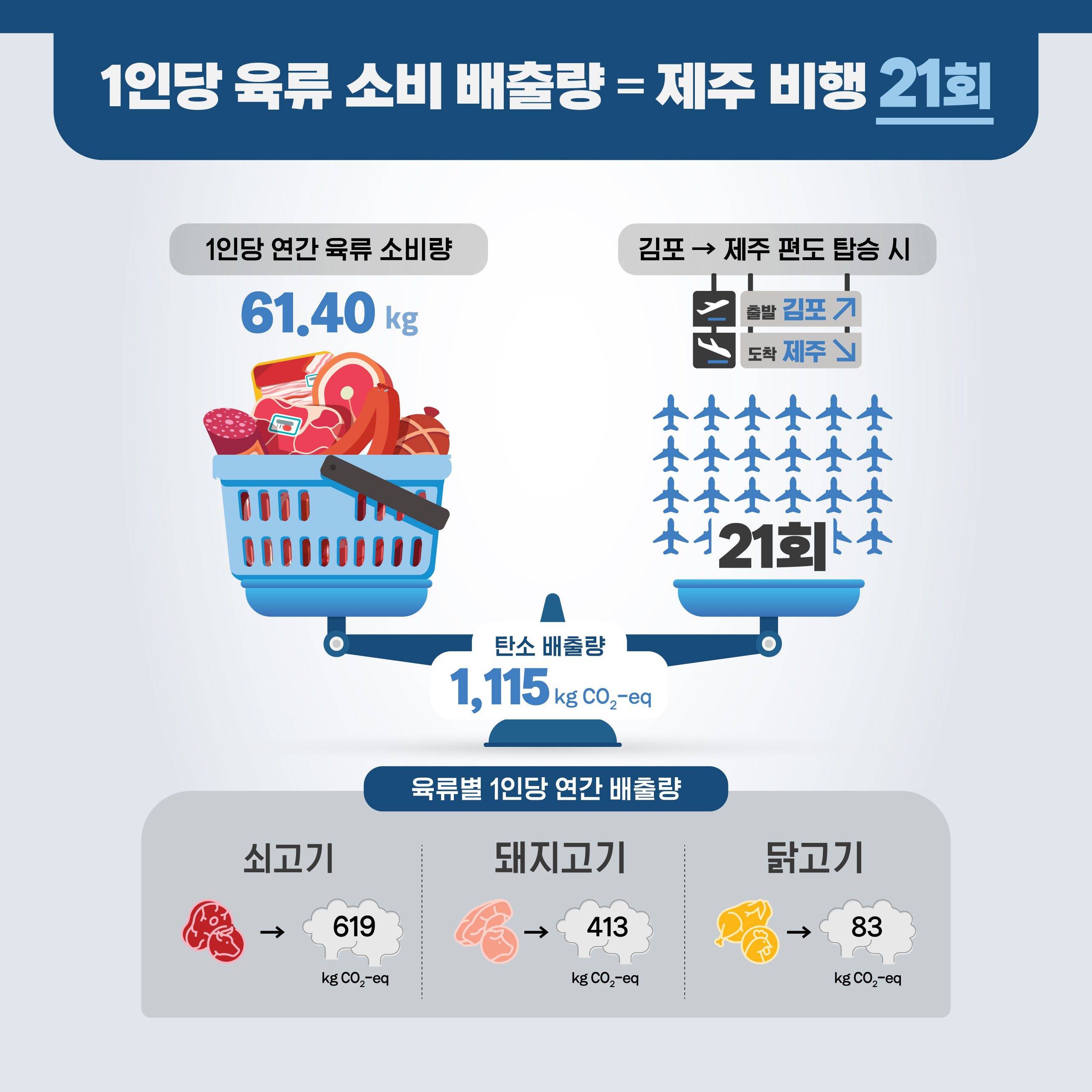 한국인 1인당 연간 육류 소비 배출량 1115kg CO₂-eq… 김포-제주 편도 항공 약 21회 수준