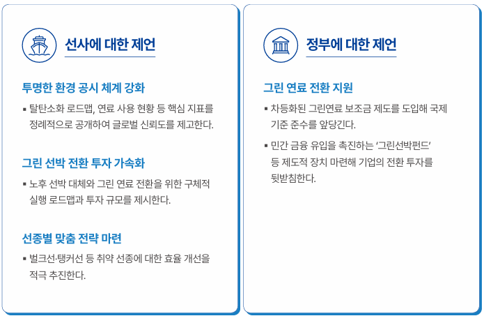 이러한 성과로는 “친환경 해운 강국”으로 도약하기에 부족하다. 탄소중립 달성을 위한 핵심 과제인 대체연료추진 선박 도입, 노후 선박 대체, 신규 선박 인도 계획 등 구조 전환의 구체적 계획과 투자 공시가 여전히 미흡하고, 특히 연료별 사용 현황의 불투명성으로 실제 이행 점검이 어렵다. 또한, 벌크나 탱커 중심 선사는 규제 노출이 커 선대 효율 개선과 전환 투자가 불가피하다. 한국 해운은 현재 “투명성과 투자”라는 이중 과제에 직면해 있으며, 전환 투자가 부족하다면 즉시 확대하고 진행 중인 과제는 정량 지표로 투명하게 공개해야 한다.