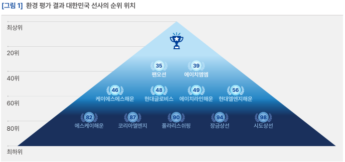 글로벌 100대 선사에 포함된 한국 주요 선사의 환경(E)부문 성적을 보면, 팬오션(68.40점), HMM(65.53점) 등 일부 대형 선사는 글로벌 평균을 상회하는 성과를 보였으나 선대 효율성 관리에서는 한계를 보이고, 다수 중소형 선사는 체계 자체가 미흡한 상황이다.