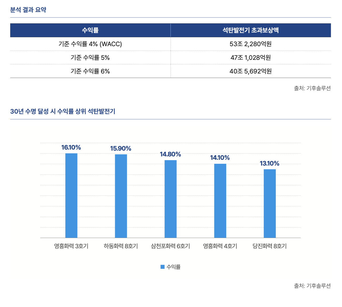 반면, 초과보상을 받고 있는 발전기를 퇴출하지 않고 30년간 운영하는 경우, 한전발전자회사가 소유한 총 53개의 석탄 발전기 중 44개 발전기가 초과보상을 받는 것으로 분석되었다. 누적 초과보상 액수는 53.2조 원에 달할 것으로 나타났다.