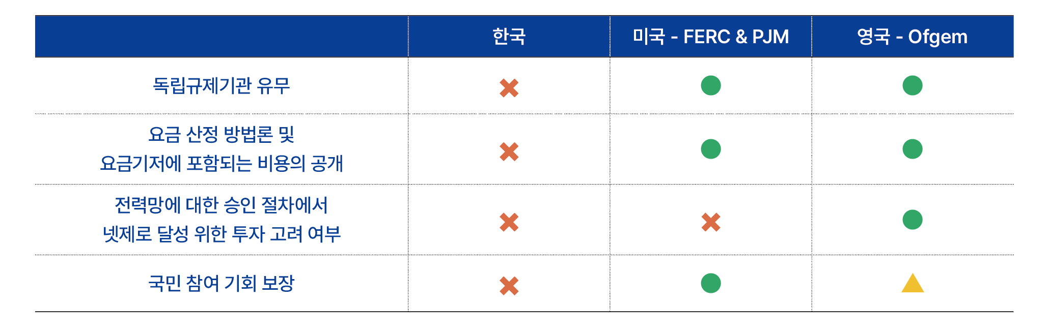 본 보고서는 한국의 송전망 이용요금 규제 체계를 영국의 Ofgem–NESO 사례 및 미국의 FERC–PJM 사례와 비교함으로써, 투명하고 공정하며 지속가능한 송전망 이용요금 규제 체계를 구축하기 위해 필요한 핵심 구조와 정책을 제시합니다. 이를 통해 재생에너지 확대를 뒷받침할 보다 많은 PPA 체결과 송전망 투자 활성화를 도모하는 제도의 방향성을 제안합니다.