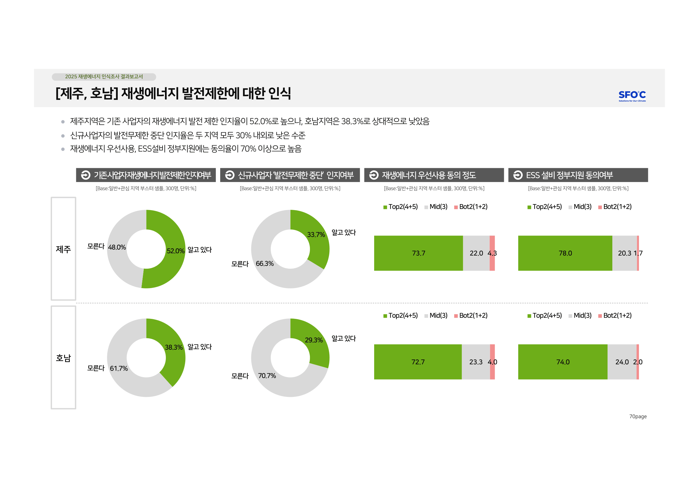 두 지역에서는 화석연료보다 재생에너지를 우선적으로 사용하는 것에 73.7%(제주), 72.7%(호남)동의했다. 재생에너지 출력제어 현상을 막기 위해 필요한 대용량저장장치(ESS)를 정부가 지원해야 한다는 동의 또한 78%(제주), 74%(호남)로 높게 나타났다.