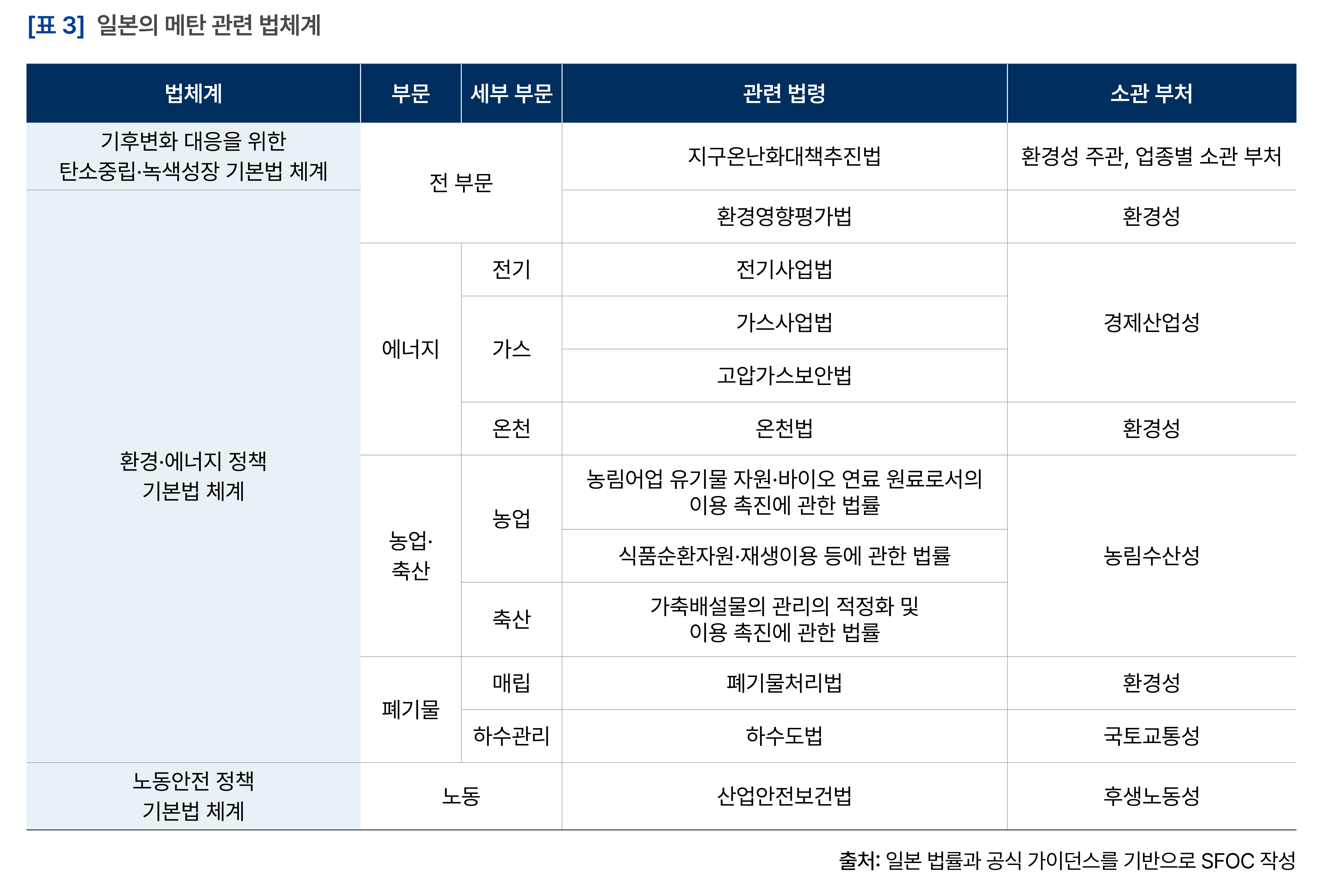 한편, 일본의 국내 제도와 정책은 이러한 에너지 공급망 전반의 투명성 강화 흐름에 아직 충분히 부합하지 있다고 보기는 어렵다. 관련 법체계는 여전히 배출 파악과 시설 안전 중심으로 설계되어 있다. 이러한 점에서 일본의 메탄 관리 체계는 국내 배출 중심의 한계를 넘어, 공급망 전반을 포함하는 방향으로 보완될 필요가 있다.