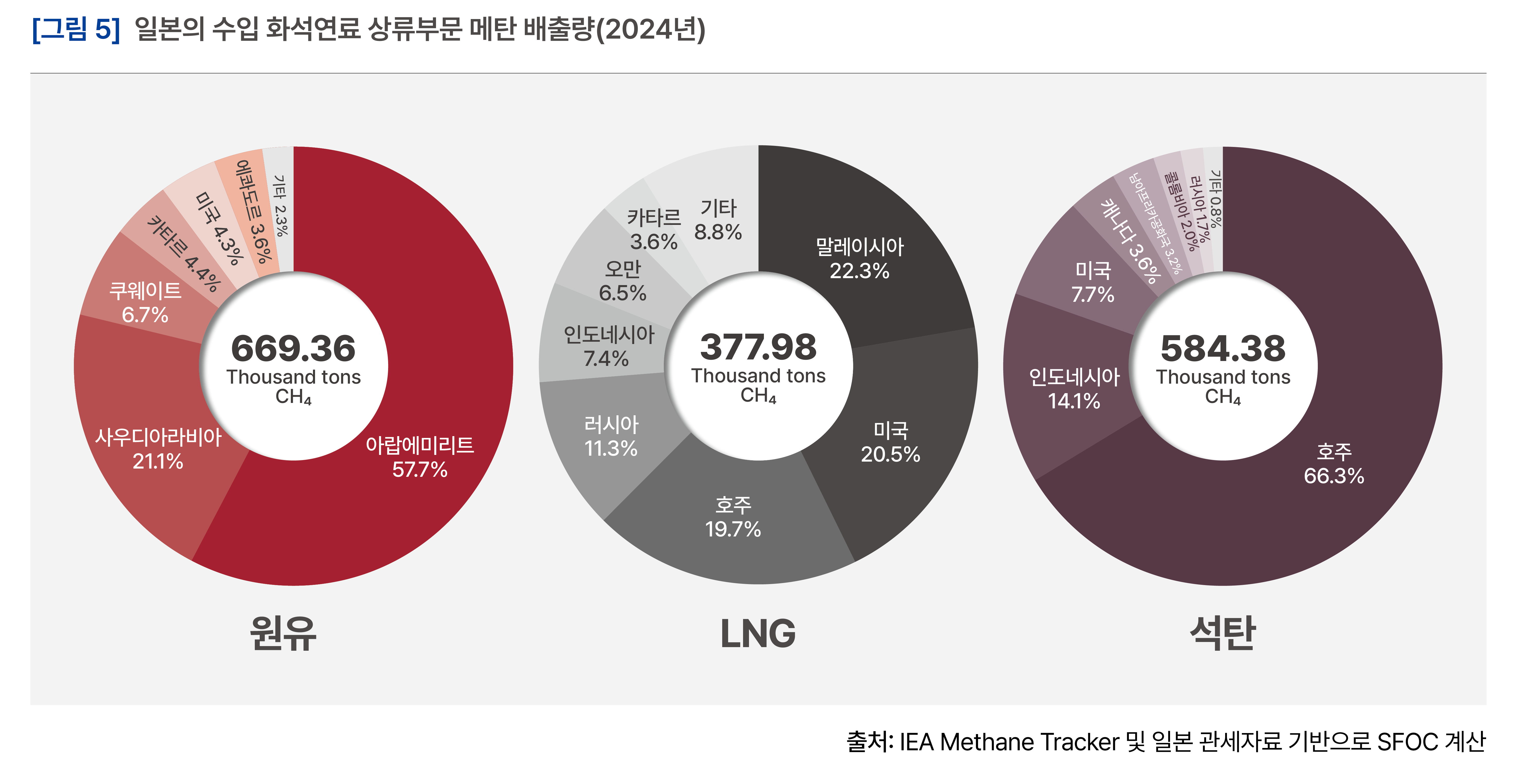 • 일본의 수입 화석연료 업스트림 메탄 배출은 원유 669 kt-CH4, LNG 378 kt-CH4, 석탄 584 kt-CH4로, 합계 약 1,632 kt-CH4로 추정