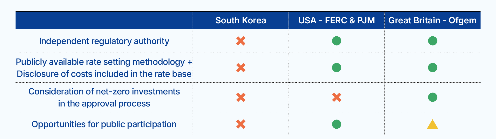 While countries such as the US and UK have independent regulatory authorities that oversee grid costs and require methodologies and rate bases to be publicly disclosed, Korea has no equivalent. KEPCO, the owner of the national transmission and distribution grid, sets grid use fee rates internally, creating a clear conflict of interest and little accountability to grid users.