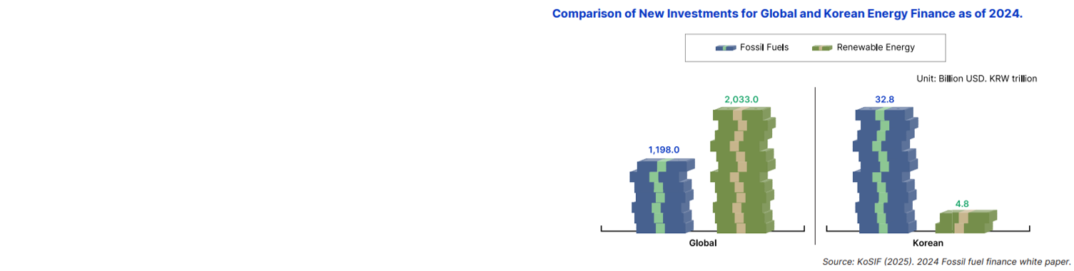 South Korea’s financial flows remain misaligned with its climate commitments. Despite global clean energy investment surpassing fossil fuels in 2023, Korea continues to channel USD 130 billion (KRW 173.7 trillion) into fossil fuels, including USD 57.8 billion into coal, while renewable investment reached only USD 18.4 billion. Coal still supplies over 30% of electricity, among the highest shares in the OECD. Such an imbalance exposes the economy to stranded assets, lost competitiveness, and missed growth opportunities.