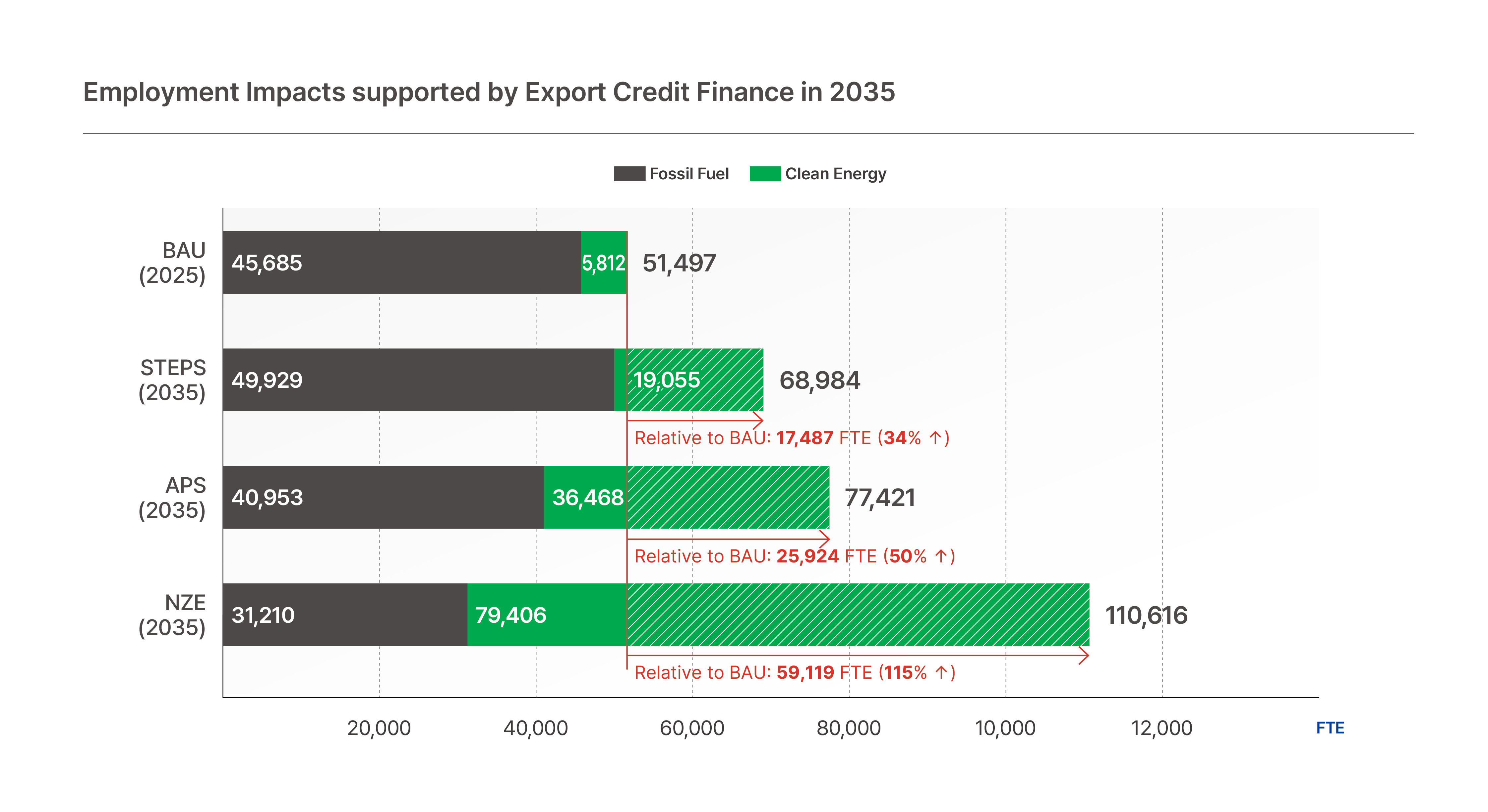 Korea's continued fossil fuel financing may actually cost jobs rather than create them. Under a Net-Zero pathway, total employment supported by public export finance reaches 110,616 full-time positions in 2035—59,119 more jobs than maintaining current fossil-dominated portfolios. Clean energy expansion contributes 73,594 additional positions across the economy, a more than tenfold increase, while fossil fuel employment declines by 14,475 positions.