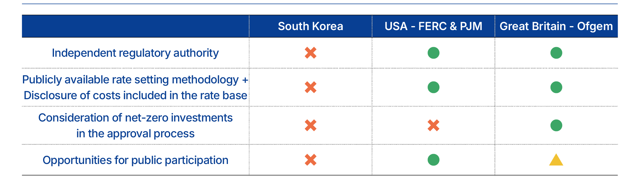 The Federal Energy Regulatory Commission (FERC) and PJM Interconnection (PJM) in the United States, and the Office of Gas and Electricity Markets (Ofgem) and the National Energy System Operator (NESO) in Great Britain, are two regulatory systems well known for their transparent and pragmatic grid fee setting procedures. Ofgem also goes a step further in incorporating actions for net-zero as factors in their approval process, stimulating investments for a renewable-friendly and sustainable power grid. These systems offer effective examples to improve South Korea’s grid fee setting systems to be more accountable, transparent, and sustainable.